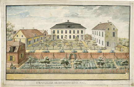Det är huset till höger som tillhör den ursprungliga malmgården. Det senare församlingshuset uppfördes på 1780-talet. På gården fanns en nyttoträdgård med fruktträd och grönsaksodlingar.