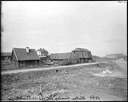 Västra Humlegårdsgatan med trähus i kvarteret Domherren. I bakgrunden stenhusbebyggelse vid Odengatan