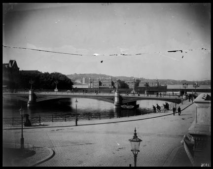 Vasabrons norra brofäste med Stockholms stads bad- och siminrättning, Strömbadet i bakgrunden