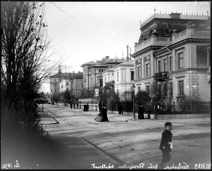 Karlavägen västerut från Floragatan. Villan Linden 8 och Heidenstamska och Adelsköldska villorna till höger.