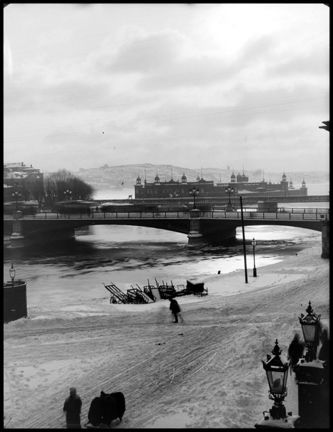 Det är vinter. I förgrunden står ett antal gamla skottkärror och lastvagnar på kajen. Vasabron syns i mitten av bilden och bortom den syns Strömbadet, kallbadhuset som låg i Strömmen mellan 1884 och 1936.