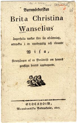 Lördagseftermiddagen den 2 September 1826 upptogs ett dött spädbarn ur vattnet vid Skeppsholmsbron. Änkan Brita Christina Wanselius arresterades och dömdes till döden för barnamord. Barnets far hade övertalat Wanselius att ta hand om barnet och försöka överlämna det till Stockholms allmänna barnhus, som förr tog hand om fattiga och föräldralösa barn. Brita Christina Wanselius avrättades på Skanstulls avrättningsplats i nuvarande Hammarbyhöjden.