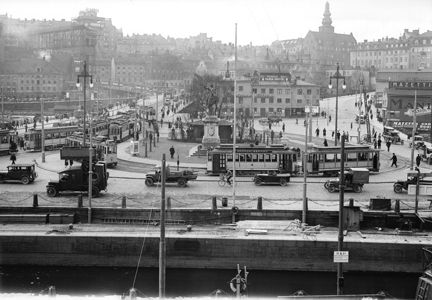 Nils Ericsson-slussen söderut mot Karl Johans Torg. T.v. i bakgrunden Katarinahissen