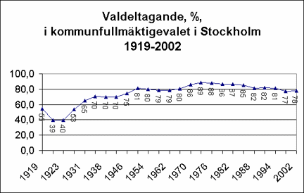 Statistik. Före 1919 var rösträtten till kommunfullmäktige graderad och beroende av inkomst. Valdeltagandet 1921 var endast 39 %. Fram till och med valet 1973 steg successivt valdeltagandet till 89 %. Efter 1973 har valdeltagandet sjunkit och var i valet 1998 nere i 77 %. Valdeltagandet steg till 78 % i valet 2002.