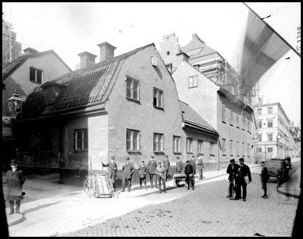 Klara Västra Kyrkogatan t.v. och Stora Vattugatan, nuvarande Vattugatan t.h