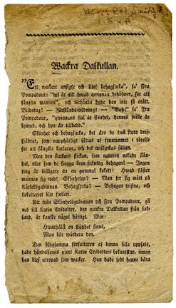 Författaren till den här skriften hade lärt känna Carin Ersdotter innan hon blev berömd som "Wackra Dalkullan". Han diskuterar vikten av ett vackert utseende för att "fånga karlarne". Och vad gör den stackars flicka "som av naturen nekades skönhet"? Delvis på vers. Frakturstil. 2 sidor