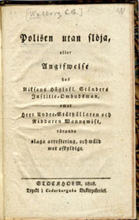 Polisen utan slöja, eller Angifwelse hos riksens höglofl. ständers justitie-ombudsman, emot herr under-ståthållaren och riddaren Wannqwist, rörande olaga arrestering, och wåld mot oskyldige.