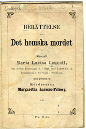 Berättelse om det hemska mordet å mamsell Maria Lovisa Laurell, som skedde Thorsdagen d. 5 Sept. 1867 i huset N:o 12, Brunnsgatan å Norrmalm i Stockholm, med porträtt af möderskan Margaretha Larsson-Friberg
