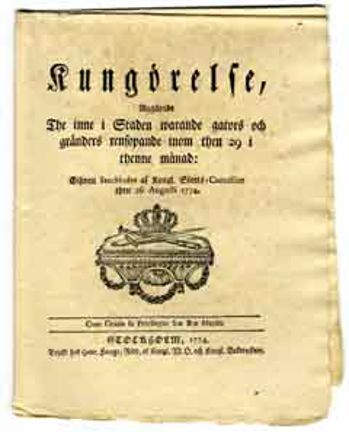 Kungörelse, angående the inne i staden warande gators och gränders rensopande inom den 29 i thenne månad: Gifwen Stockholm af Kongl. Slotts-cancelliet then 26 augusti 1774