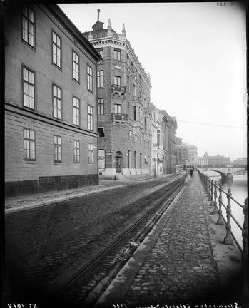 Närmast till vänster det Bondeska palatset som revs 1899. På andra sidan Drottninggatans mynning ligger det Adelswärdska palatset, därefter Sagerska huset och Arvfurstens palats. I fonden den nya Operan under uppförande.