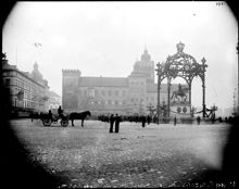Norrbro och Gustav Adolfs Torg under Gustav II Adolfs jubileum, från Helgeandsholmen. T.h. kulissarkitektur av Gamla slottet Tre kronor på gamla operans plats