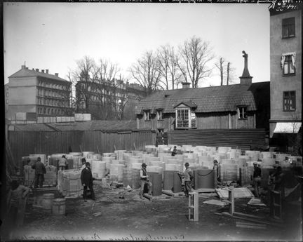 Humlegårdsgatan 31, gårdsinteriör under gjutning av avloppstrummor