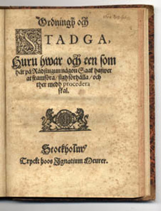 [Bestämmelser hur domstolsärenden ska behandlas] Ordningh och stadga, huru hwar och een som här på Rådstugan någon saak hafwer at framföra, sigh förhålla, och ther medh procedera skal.