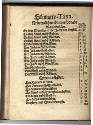 Allmänheten klagade på att hantverkarna tog för mycket betalt för sina varor. Stadens styrelse bestämde då priser för de olika hantverkens varor som alltså inte fick överskridas. Här har vi skinnarskråets prislista.