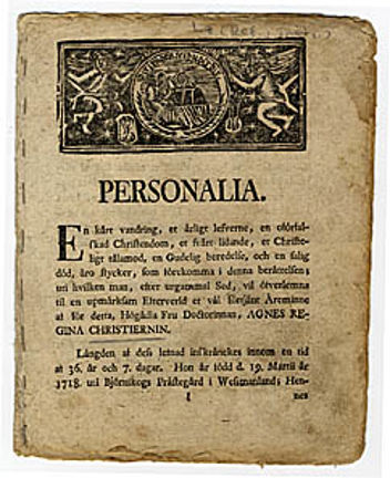 "Personalia" betyder ungefär "om en person". Det är just vad det är. Den handlar om Agnes Regina Christiernin. Texten lästes upp vid Agnes Reginas begravning 1754. Skriften är en del av Agnes Reginas så kallade likpredikan. Där beskrivs hennes liv från barndom till hennes allra sista tid i livet.