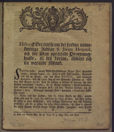 Historisk berättelse om det fordna riddar S. Jörans hospital, och det sedan uprättade Drottninghuset, til dess början, tilwäxt och nu warande tilstånd / Eric S. Ruda