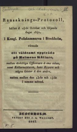 Ransaknings-protocoll, hållet d.14 oct.& följande dagar 1842 i k.poliskammaren i Stockholm, rörande ett våldsamnt uppträde på Malmens källare.