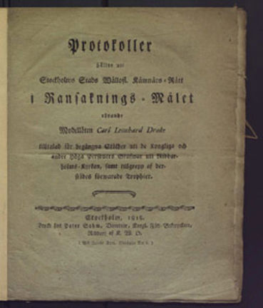 [Domstolsmål angående stöld från Riddarholmskyrkan] Protokoller hållne uti Stockholms stads wällofl. kämnärs- rätt i ransaknings-målet rörande modellören Carl Leonhard Drake tilltalad för begångna stölder uti de kongliga och andre höga personers grafwar uti Riddarholms-kyrkan
