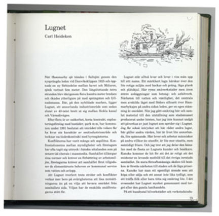 Lugnets industriområde finns inte längre. Industriområdet etablerades på 1940-talet. Det var känt som ett område för småföretagare. Lite slitigt och fullt av riktiga personligheter. En slags fristad. Nu är Lugnet bebyggt med bostäder och kallas Hammarby Sjöstad. Redan 1990 började man planera området som vi ser det nu. 13 sidor. Illustrerad.