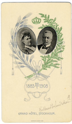 Här en meny från Grand hotel. Det är en 25-årig bröllopsdag som ska firas ordentligt. Huvudpersonerna kan vi se på framsidan av skriften. Menyn är elegant och påkostad. Och naturligtvis skriven på franska! Musiken är blandad men säkert vald efter hederspersonernas musiksmak. 4 sidor. Illustrerad.