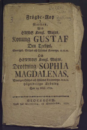 Här flera hyllningsdikter till Sofia Magdalena och Gustav III som kröntes den 29 maj 1772. Kungen och drottningen hyllas med varsin dikt. Också änkedrottningen Lovisa Ulrika, Gustavs döda far och hans syskon lovtalas.