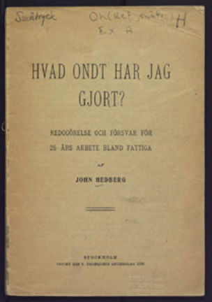 Frikyrkopastor John Hedberg tycker att han har blivit orättvist behandlad av tidningar och av den statliga kyrkan. Här skriver han om den verksamhet som han bedriver i Stockholm. Han hjälper fattiga stockholmsbarn att få placering i nya hem på landet. Hans hjälporganisation har också köpt ett hus i Sundbyberg där han inrättat ett barnhem. Meningararna går isär om Hedbergs sociala projekt; en del tycker att han går förbi de samhällsinstitutioner som egentligen ska ta hand om dessa barn. 70 sidor.