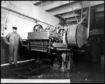Interiör från Münchenbryggeriet, Söder Mälarstrand 25-79/Torkel Knutssonsgatan 2. Bryggeriarbetare vid 100-korkare