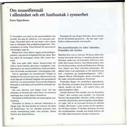 Här funderar artikelförfattaren över den roll som ett museiföremål kan spela i vår tid. Vilka signaler det ger betraktaren. Hon menar att det är viktigt att vi tänker på hur vi påverkas av alla prylar vi har runt omkring oss. Att gå på museum och titta på gamla föremål kan skärpa vår observationsförmåga. Vi tvingas att sätta oss in i en annan tid och vad just detta föremål kan ha haft för betydelse där. Det gör att vi får större tankefrihet och fantasiförmåga.