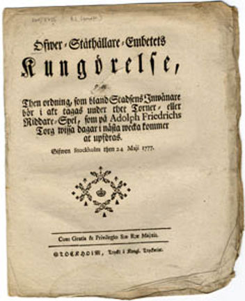 [Regler för invånarna under tornerspel] Öfwer-ståthållare-embetets kungörelse, om then ordning, som bland stadsens inwånare bör i akt tagas under thet torner- eller riddare spel, som på Adolph Friedrichs torg kommer at upföras