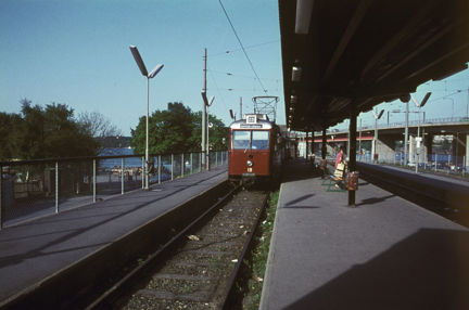 Lidingöbanans ändhållplats vid Ropsten. T.h. i bakgrunden Lidingöbron