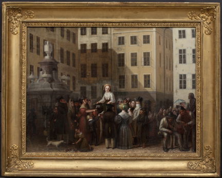 I bildens mitt ser vi människor som trängs runt en kvinna i folkdräkt. Hon står på en vagn och häller upp mjölk ur sin kanna. En kvinna ur borgerskapet sträcker fram sitt krus, men hon tittar inte på mjölken som fylls på utan istället upp mot kvinnans ansikte. Även de andra personerna runt henne, elegant klädda kvinnor och män i moderiktiga kläder, tittar hänfört upp mot mjölkförsäljerskan. I fönstren skockas människor som bevittnar händelsen på torget.