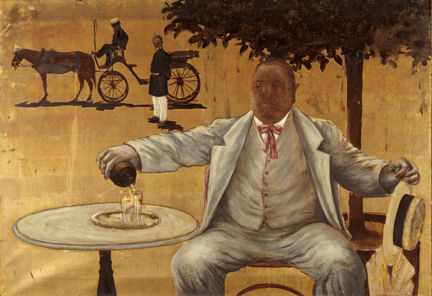 Denna målning har suttit på ett väggfält i Restaurant Du Nord som var en populär restaurang på Kungsträdgårdsgatan. Hotellet revs 1912. I Kungsträdgården fanns även en vattenbutik. Mannen som intar sitt mineralvatten har slagit sig ned utanför butiken i skuggan under ett träd. Det ser ut som om det är en varm dag. I romanen Doktor Glas av Hjalmar Söderberg blir pastor Gregorius mördad just utanför denna vattenbutik.