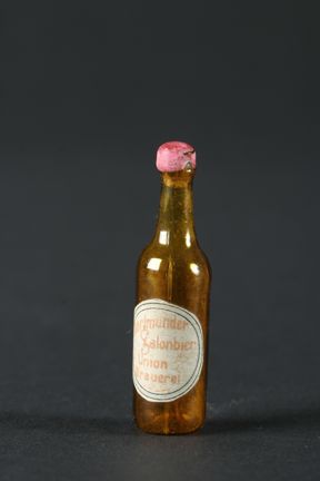 Dockskåpsinventarie. Ölflaska av brunt glas med rosa kork. Pappersetikett med texten "Dortmunder Salonbier Union Braueret".