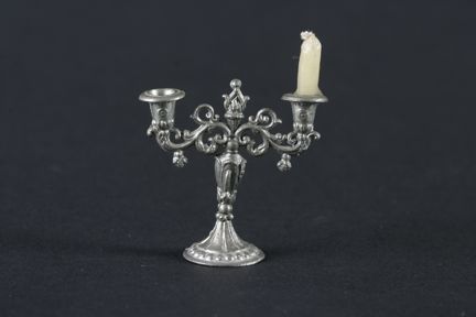 Dockskåpsinventarie. Tvåarmad kandelaber av gjutet tenn. Ett ljus av vax sitter i.