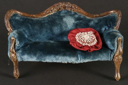 Dockskåpsinventarie. Soffa i nyrokokostil av mörkbetsat, snidat trä. Sits, rygg och armstöd är klätt med blå sammet. Soffan ingår i en möbel som består av en soffa och sex stolar. Den röda dynan som syns på fotot hör inte till soffan, men kommer från samma samling dockskåpsinventarier.