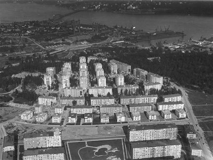 Flygbild över Gärdesstadens övre del mot nordost. Till höger i fonden Värtahamnen