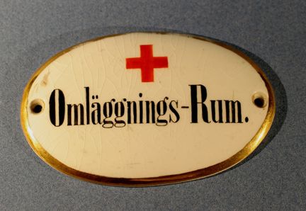 Oval dörrskylt av porslin, svagt utåtbuktande. Framsidan är glaserad och försedd med förgyllda kanter. På skylten är ett rött kors målat och under detta står med svarta bokstäver: "Omläggnings-Rum.". Skylten har två hål för upphängning. På baksidan finns en inpressad stämpel: "RB", "A1" samt "RÖRSTRAND" inom fyrkantig ram.