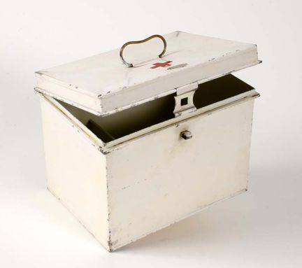 Vitmålad sjukvårdslåda av metall med uppfällbart lock. På lockets ovansida är ett rött kors målat. Här finns även ett smalt handtag av mässing, samt en metallbricka med stämplat firmanamn: "ALBERT STILLE STOCKHOLM". Inuti är lådan uppdelad i tre fack, två mindre och ett större.