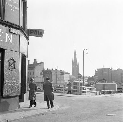 Mäster Samuelsgatan 37. Vy väster ut, mot Klara kyrka och kvarteren Skansen (t.v.) och Sporren (t.h.). Kvarteret Hoven och Sporrens östra del är rivna