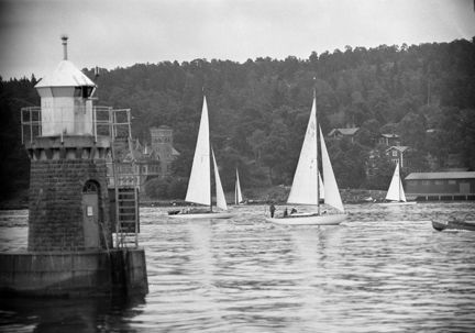 Ledfyren utanför Blockhusudden. Finska segelbåtar seglar förbi