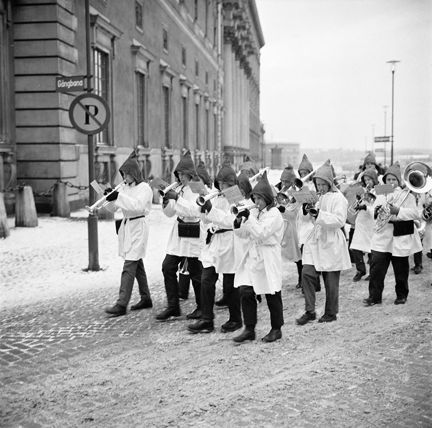 Slottsbacken. Tomtegossorkestern blåste traditionsenligt in Stockholmsgillets julmarknad på Stortorget