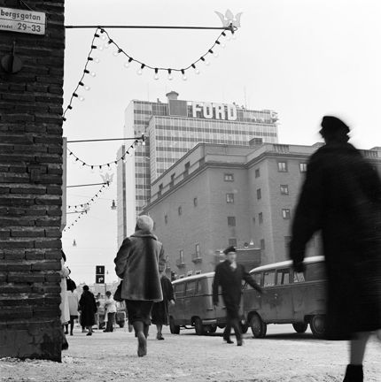 Gatubild från hörnet Sveavägen - Apelbergsgatan mot Konserthuset och Första Hötorgshuset