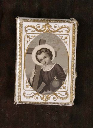 Begravningkonfekt av morsell, omslagen med vitt papper. Omslagspappret har präglat dekorativt mönster i guld, samt inom oval en bild av en ängel som håller i ett kors och ett riksäpple**. På baksidan står skrivet: "Annie från Farfars begrafning".