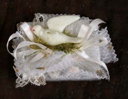 Begravningskonfekt av morsell, omslagen med silverfärgat papper med präglat blommönster. Konfektens ovansida är dekorerad med en vit duva av dragant på en bädd av veckad vit gasväv med fastklistrade små silverstjärnor av papper, vita sidenband och konstgjorda gröna kvistar. På konfektens undersida står skrivet: " Från Tant Julias Begrafning 15 Febr 1908".