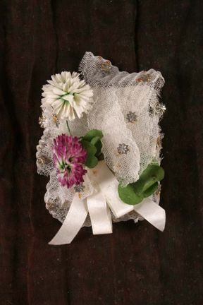 Begravningskonfekt av morsell, omslagen med silverfärgat papper. På konfektens ovansida är draperad vit gasväv monterad tillsammans med vita sidenband, tygblommor och små silverstjärnor av papper. På konfektens undersida står skrivet: ”Elsa Flensburg från sin Mormors Begrafning”.