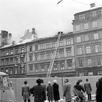 Grupp av åskådare betraktar släckningsarbete på taket till Arvid Nordquist HAB, Biblioteksgatan 27