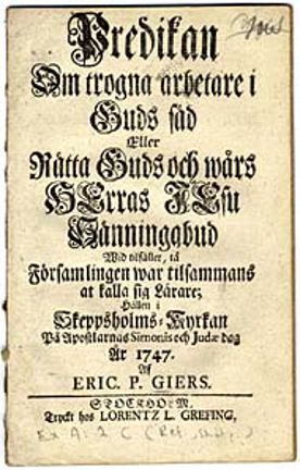 Predikan om trogna arbetare i Guds säd eller Rätta Guds och wårs herras Jesu sänningabud wid tilfället, tå församlingen war tilsammans at kalla sig lärare; hållen i Skeppsholms-kyrkan på apostlarnas Simonis och Judae dag år 1747.
