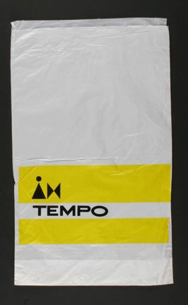 Vit plastpåse utan handtag med tryck på ena sidan: två gula fält och mellan dessa texten "TEMPO" i svart.