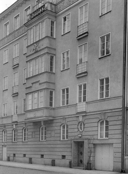 Slutligen visar jag ett fotografi taget år 1948, föreställandes husfasaden till Östermalmsgatan 27, som ligger i närheten av Kajsas hus. "Det där ser ju ut exakt som det gör nu, där är det ingenting som har förändrats", konstaterar hon.