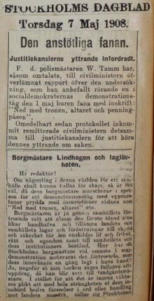 I förstamaj-demonstrationen 1908 bar Johan Valentin Wald en fana med texten "Ned med tronen, altaret och penningapåsen!". Wald dömdes senare till böter för hädelse. Birger Svahn åtalades två gånger 1908, dels för att han busvisslade åt kungafamiljens kortege och dels för att han gav ut en antimilitaristisk skrift.